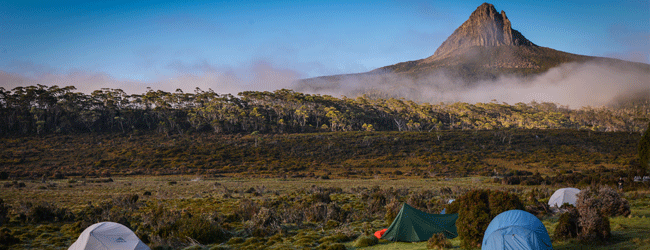The location of the first campsite along the Overland Track, Waterfall Valley is situated about 12 kms from Ronny Creek, at the start of the track. While there is a communal cabin walkers can choose to sleep in, we prefer to camp on the grass, where there are unparalleled views of Barn Bluff in the distance. With wildlife wandering around such as wallabies, wombats, spotted quolls and possums, the first evening’s complete immersion into nature is one of the most memorable moments along the trail.